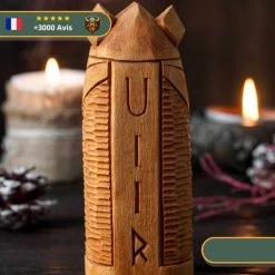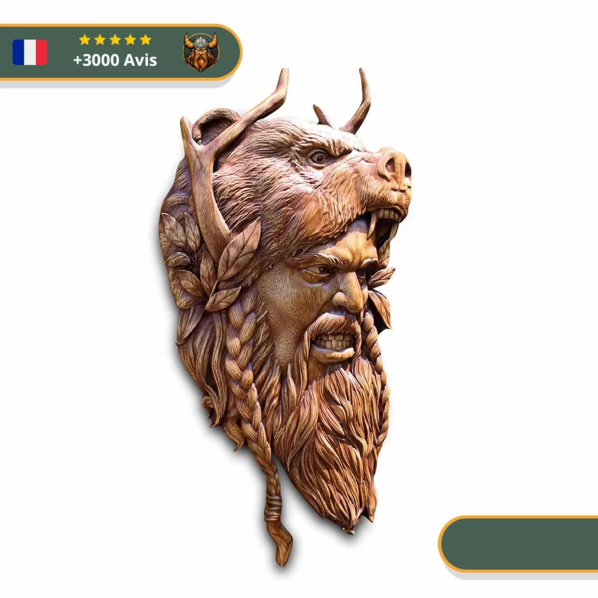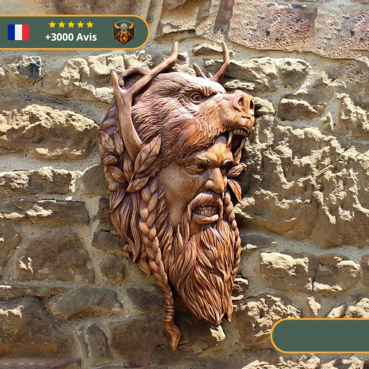 Les Berserkers, combattants vikings dotés d’une force surhumaine, sont issus de confréries transmises de génération en génération. Généralement grands et musclés, ils étaient capables de terrasser l’ennemi et imposaient la terreur à leurs adversaires. Souvent, ils se battaient sans armure et leur rage de combattre était incontrôlable. Cet art mural représente parfaitement le visage d’un Berserker, portant la peau de l’ours qu’il a tué durant son rituel d’initiation.