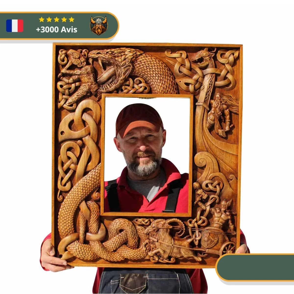Connaissez-vous le Ragnarök ? Ce mythe nordique présumé de la fin du monde, dans lequel les dieux Ases combattront les forces du mal, comme le loup Fenrir par exemple. Ce magnifique Art Mural Viking Cadre de Thor au Ragnarök retrace les scènes de ce combat final, où Thor est à bord de son drakkar et de son char tiré par ses deux boucs pour se battre contre son ennemi de toujours, le serpent des mers Jormungand. Thor remporte ce duel, mais meurt lui-même de son venin quelques heures plus tard. Thor est le protecteur des humains et ce cadre peut vous protéger.