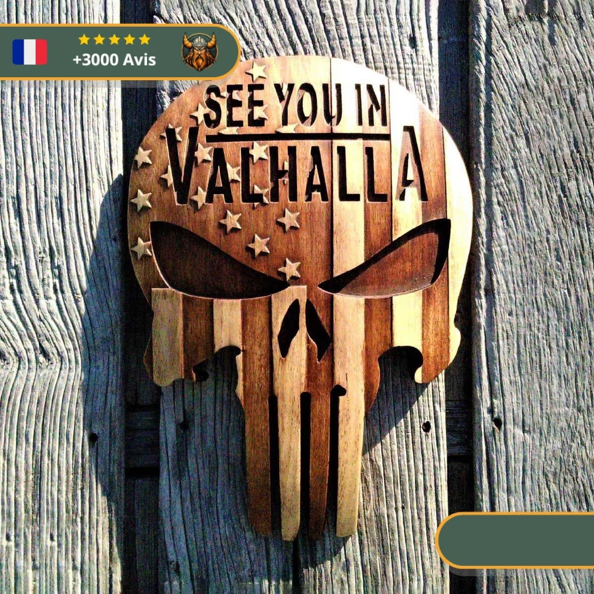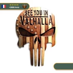 La culture viking est très populaire aux États-Unis. Cette décoration murale représente une tête de mort marquée du drapeau américain, avec en slogan « See you in Valhalla » – « Rendez-vous au Valhalla » en français. Parfait pour un intérieur inspiré par le style texan.