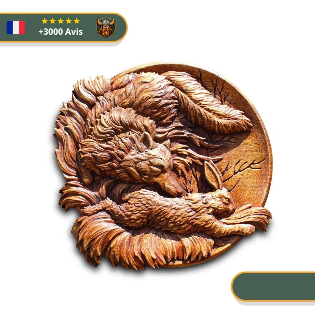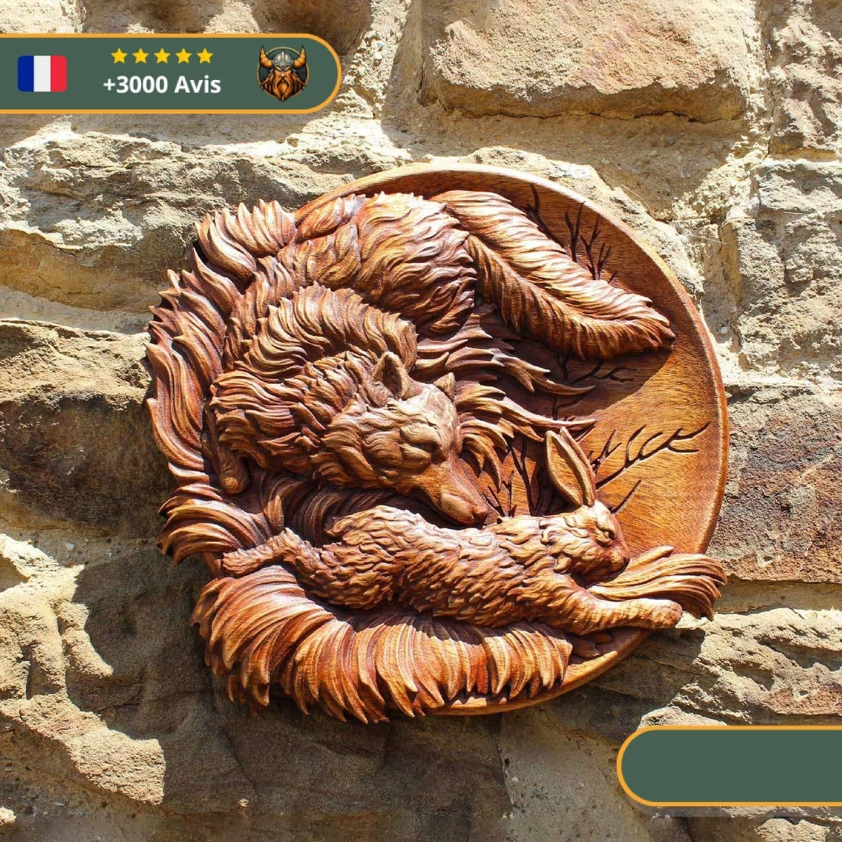 Offrez à votre intérieur viking une touche de nature nordique. Ce motif représentant un loup et un lapin sautant dans la neige rappelle l’âme sauvage et indomptée des terres ancestrales. Réalisé à la main par un artisan, cette décoration murale sera parfaite dans toutes les pièces de votre domicile, qu’il s’agisse du salon, de la chambre ou de la cuisine.