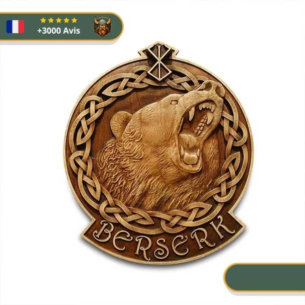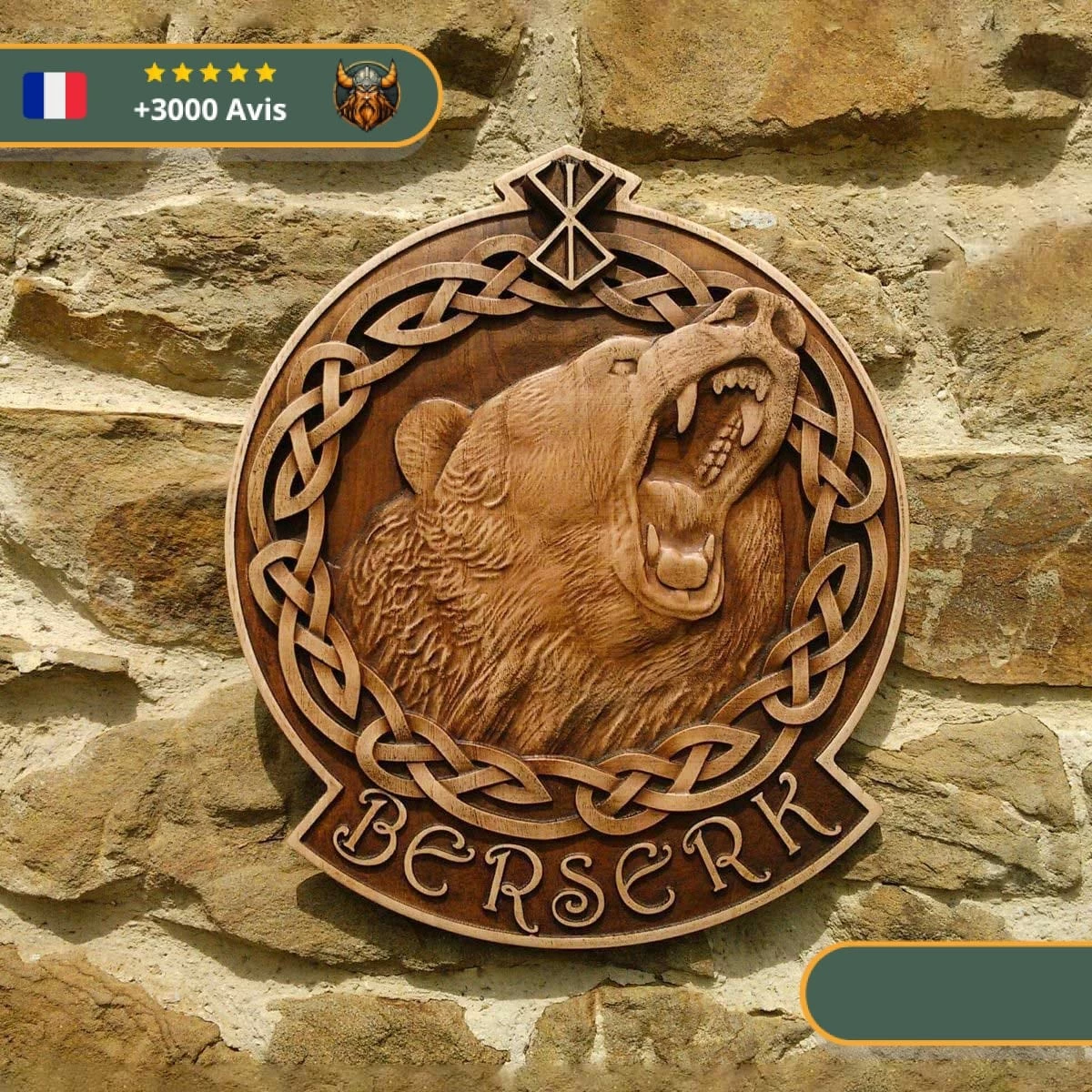 Êtes-vous familiarisés avec les Berserkers ? Ce sont des guerriers vikings qui sont habités par une fureur dévastatrice lors des batailles. Le plus célèbre d’entre eux est celui de la bataille de Stamford Bridge. Seul, il a tué des dizaines de soldats Anglo-Saxons. Finalement, c’est la seule bataille que les vikings ont perdu en Angleterre. L’animal totem des Berserkers est bien sûr l’ours.L’ours est symbole de puissance et de force. Il est le roi des bêtes en Scandinavie et représenté sur ce tableau mural en bois avec le symbole « Berserk » à son sommet.