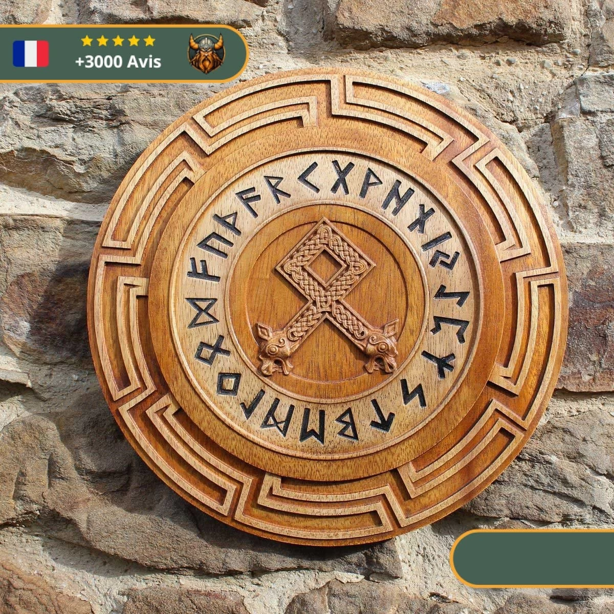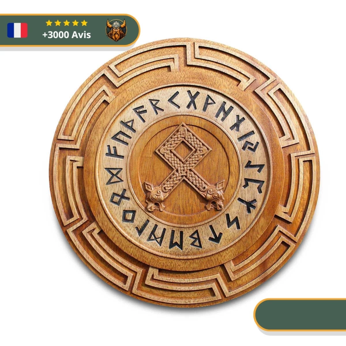 La rune Odal, qui occupe le centre de ce décor en bois, est un symbole de prospérité et de richesse de l’héritage. Par conséquent, cette décoration murale incarne le patrimoine nordique. En effet, la rune Odal se retrouve au milieu d’un cercle contenant tous les caractères du Futhark, l’alphabet runique nordique. Sur les extrémités de la rune, deux têtes de loup font office de détail scandinave mythologique subtil. Il ne fait aucun doute qu’il s’agit de Geri et Freki, les loups d’Odin qui se tiennent au Valhalla.