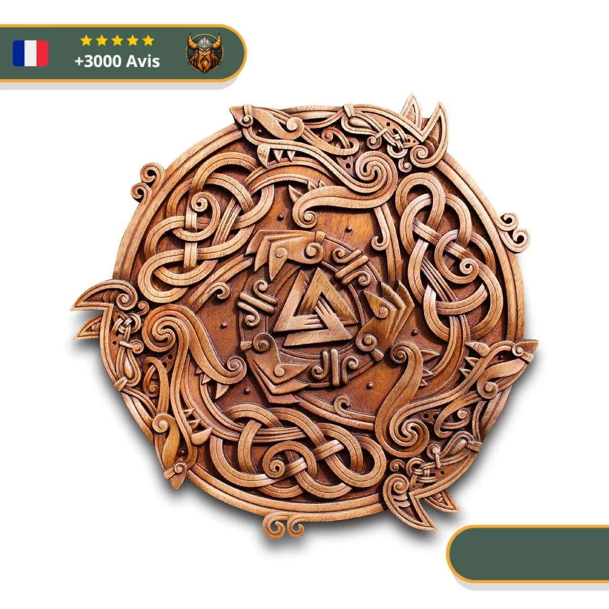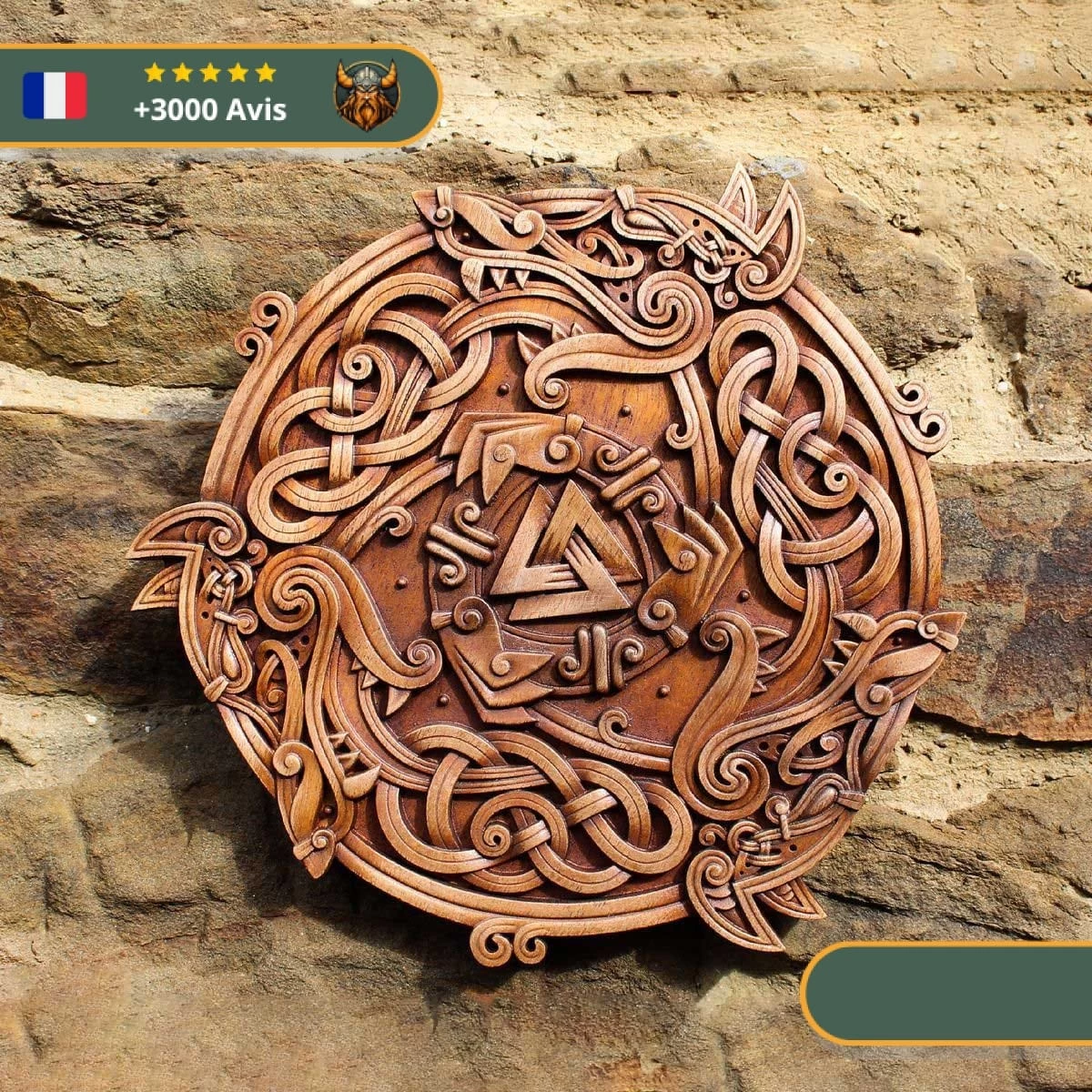 Fenrir, Skoll et Hati sont les trois redoutables prédateurs qui annonceront le Ragnarök. Une fois que Skoll et Hati auront attrapé le Soleil et la Lune, ils les avaleront, plongeant le monde dans les ténèbres. Ce sera aussi le jour où Fenrir se libérera de ses chaînes et affrontera Odin. Ce chef-d’œuvre mural en style Oseberg illustre ces trois forces du mal en action. Le style Oseberg est une forme d’art viking représentant des créatures issues de la mythologie nordique. Il était très apprécié et honoré par nos ancêtres.
