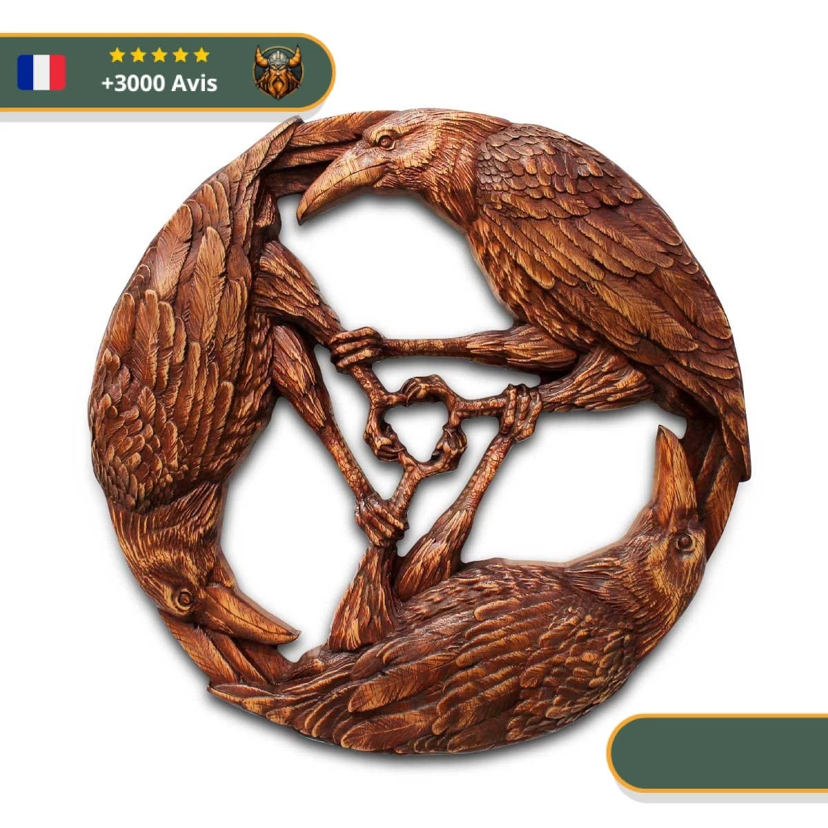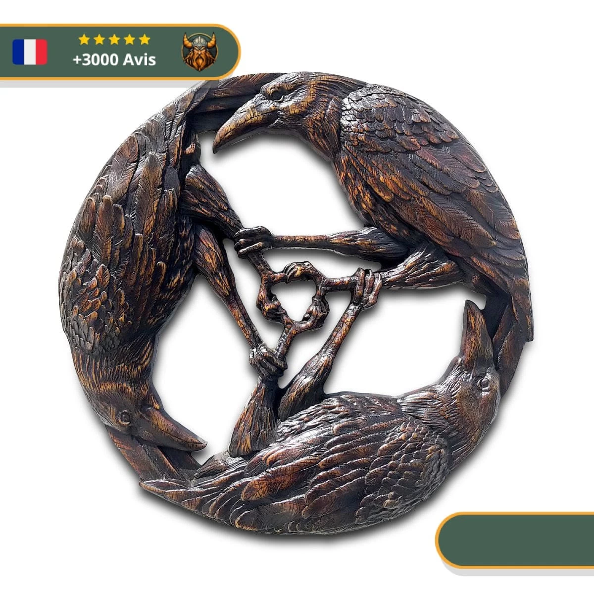 Ces trois oiseaux représentent la notion du temps qui passe. On les appelle passé, présent et avenir, ce qui fait une roue complète. Dans la mythologie nordique, les corbeaux sont emblématiques de la sagesse et de la connaissance. Hugin et Munin sont les plus connus, ce sont les messagers d’Odin, représentant respectivement la pensée et la mémoire. Dans leur voyage, ils recueillent des informations qu’ils rapportent à leur maître, le dieu des dieux. Ce tableau mural sera magnifique pour embellir votre salon ou toute autre pièce.