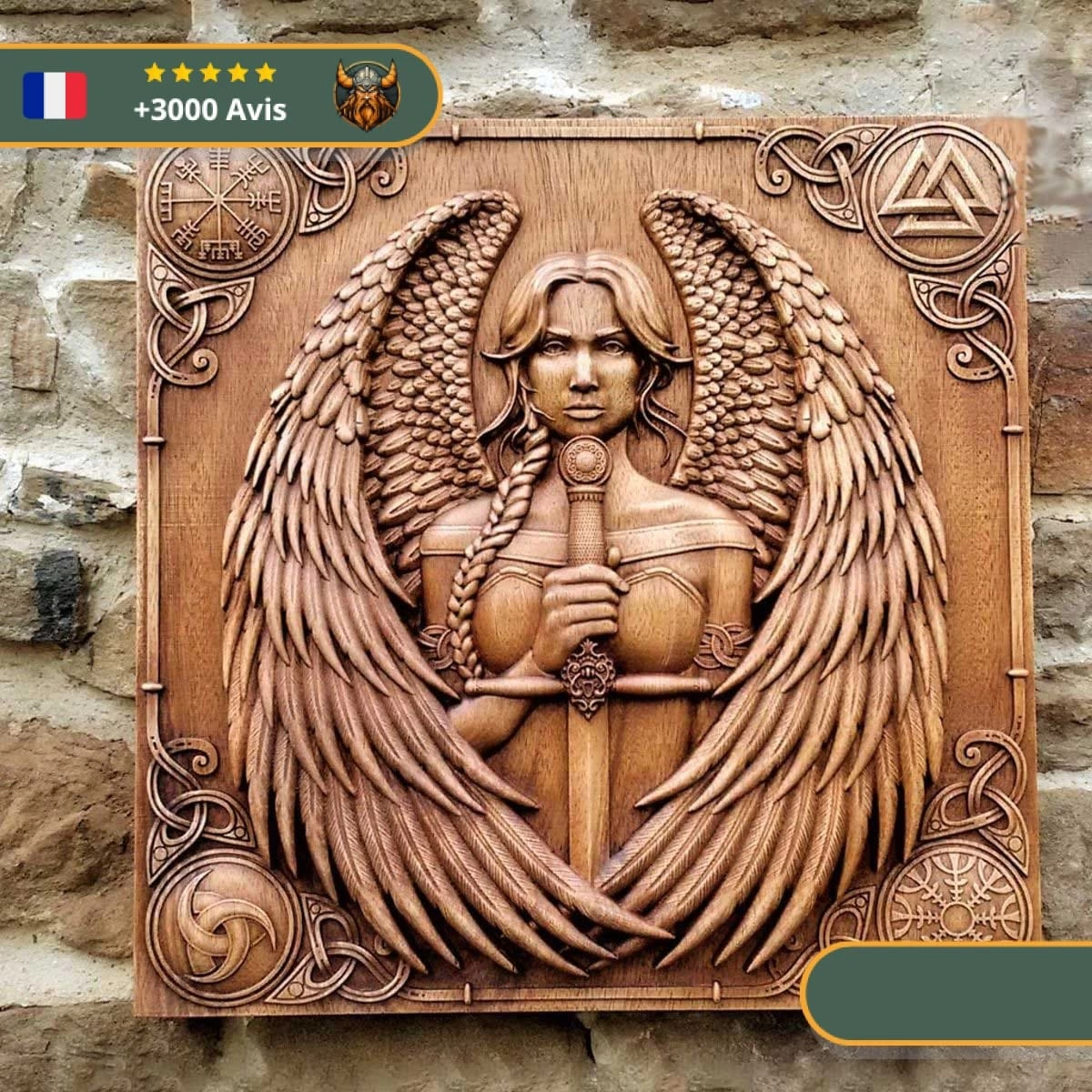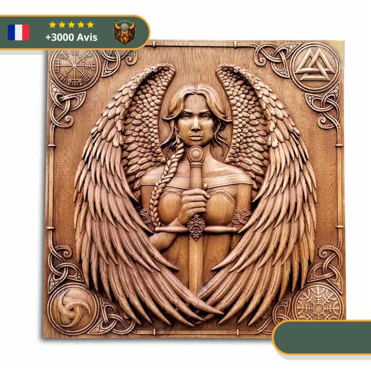 Les Valkyries sont des femmes qui sélectionnent les combattants qui peuvent se rendre au Valhalla. Seuls ceux qui se sont battus bien et qui sont morts avec héroïsme peuvent arriver à la salle d’Odin à Asgard. La plus célèbre de toutes les Valkyries est certainement la déesse Freyja. Sur cet objet d’art mural, on peut retrouver la Valkyrie comme décrit dans les mythes, dotée d’immenses ailes et armée de son épée. Aux quatre coins de cet art mural se trouvent des symboles nordiques. Saurez-vous les reconnaître? Fabriqué à la main par notre artisan Oleg.