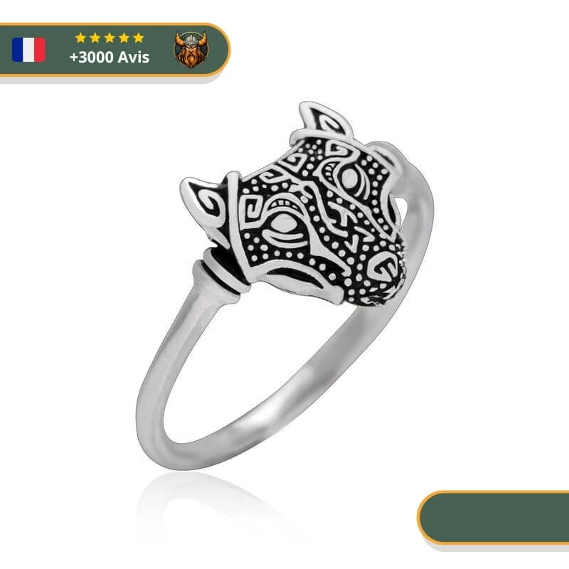 Bague en argent 925 représentant la tête du loup Fenrir, fléau des dieux de la mythologie nordique.