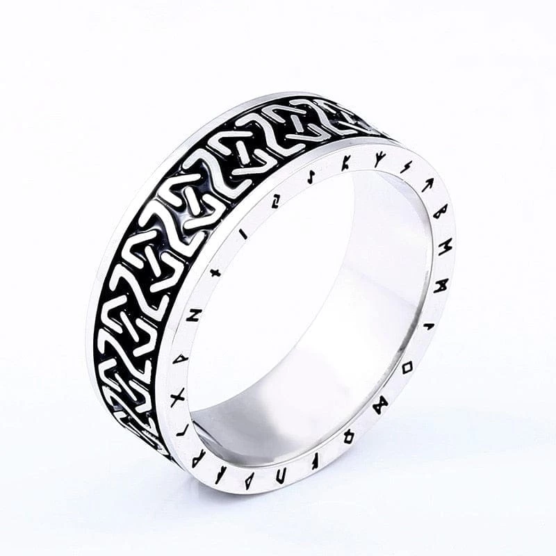 Notre magnifique anneau en métal inoxydable est orné de superbes détails qui représentent les symboles de l’alphabet viking.