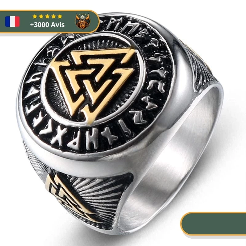 Cette magnifique chevalière en acier inoxydable est ornée d’un Valknut et de runes. Ces deux symboles sont étroitement liés au dieu Odin.