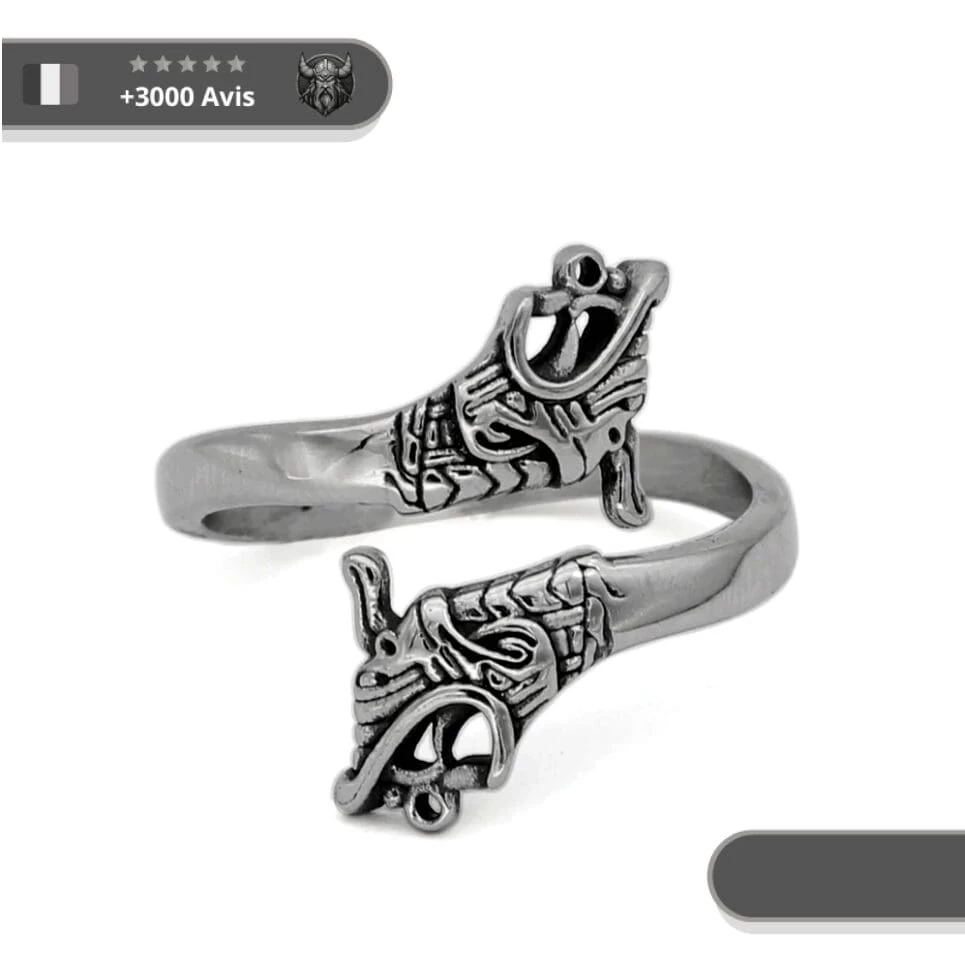 Cette magnifique bague en acier inoxydable représente deux têtes de dragons trônant fièrement aux extrémités des drakkars.