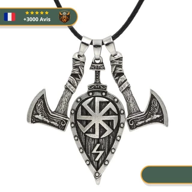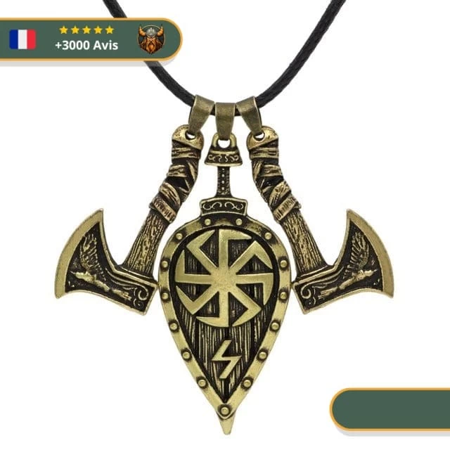 Ce ravissant collier représente deux haches et un bouclier sur lequel est gravé le symbole du soleil noir.