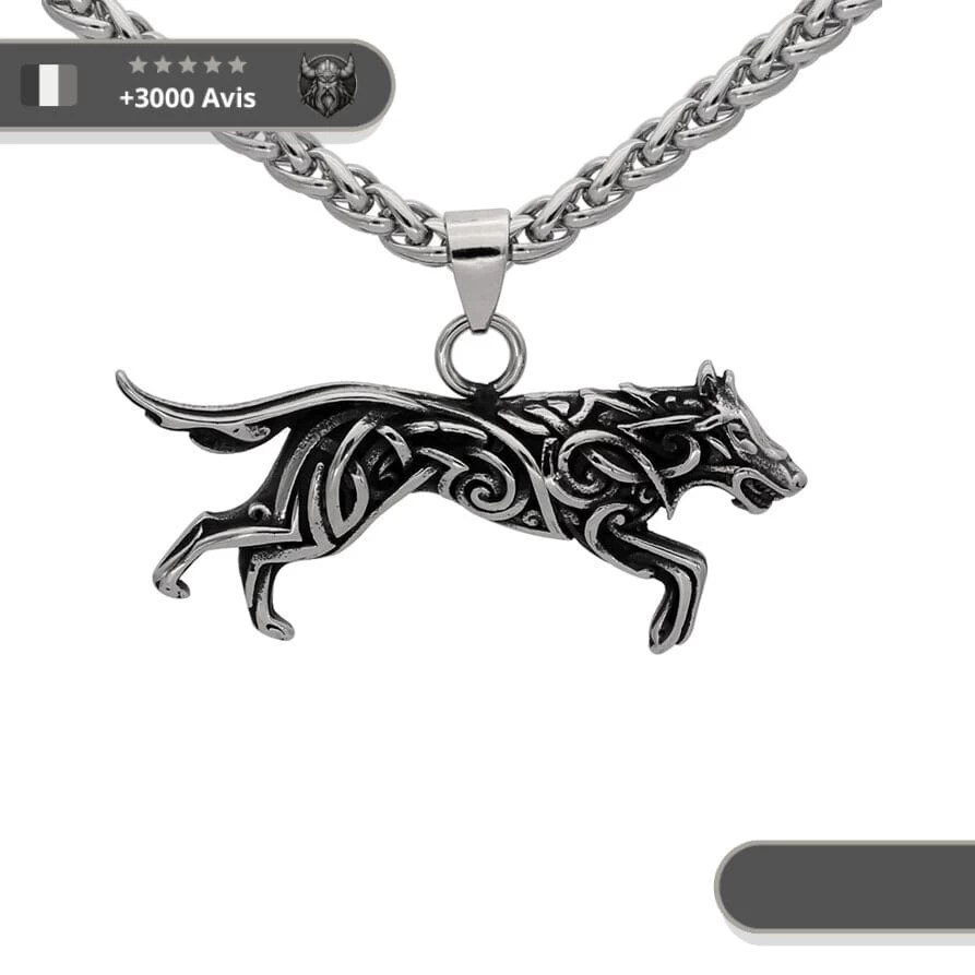 Ce magnifique collier en acier inoxydable est orné de gravures représentant le loup Fenrir de la mythologie nordique. La chaîne de 60cm est exclusive et non vendue en magasin. La qualité des finitions et la taille choisie sont contrôlées par notre équipe et chaque produit est soigneusement emballé avant expédition.