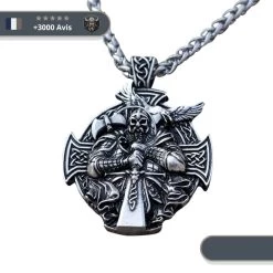 Ce pendentif est une représentation de l’héroïsme d’un guerrier viking accompagné d’Odin et son corbeau totem.
