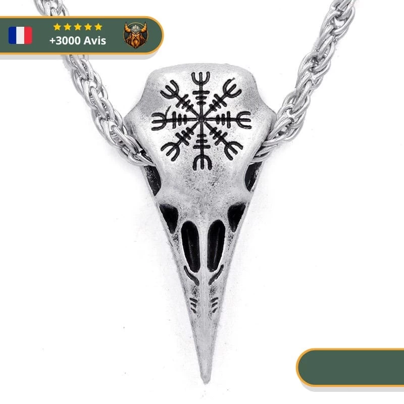 Ce collier est orné d’un crâne de corbeau et est gravé du symbole islandais Aegishjalmur.