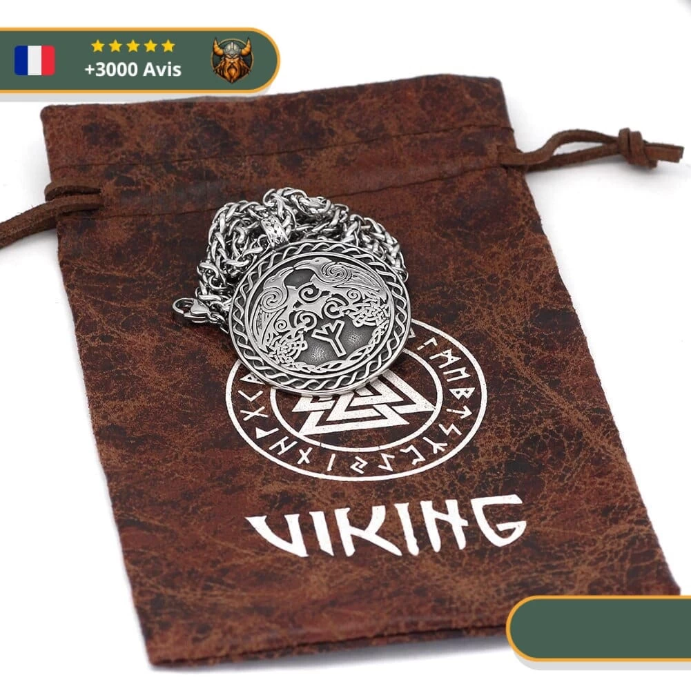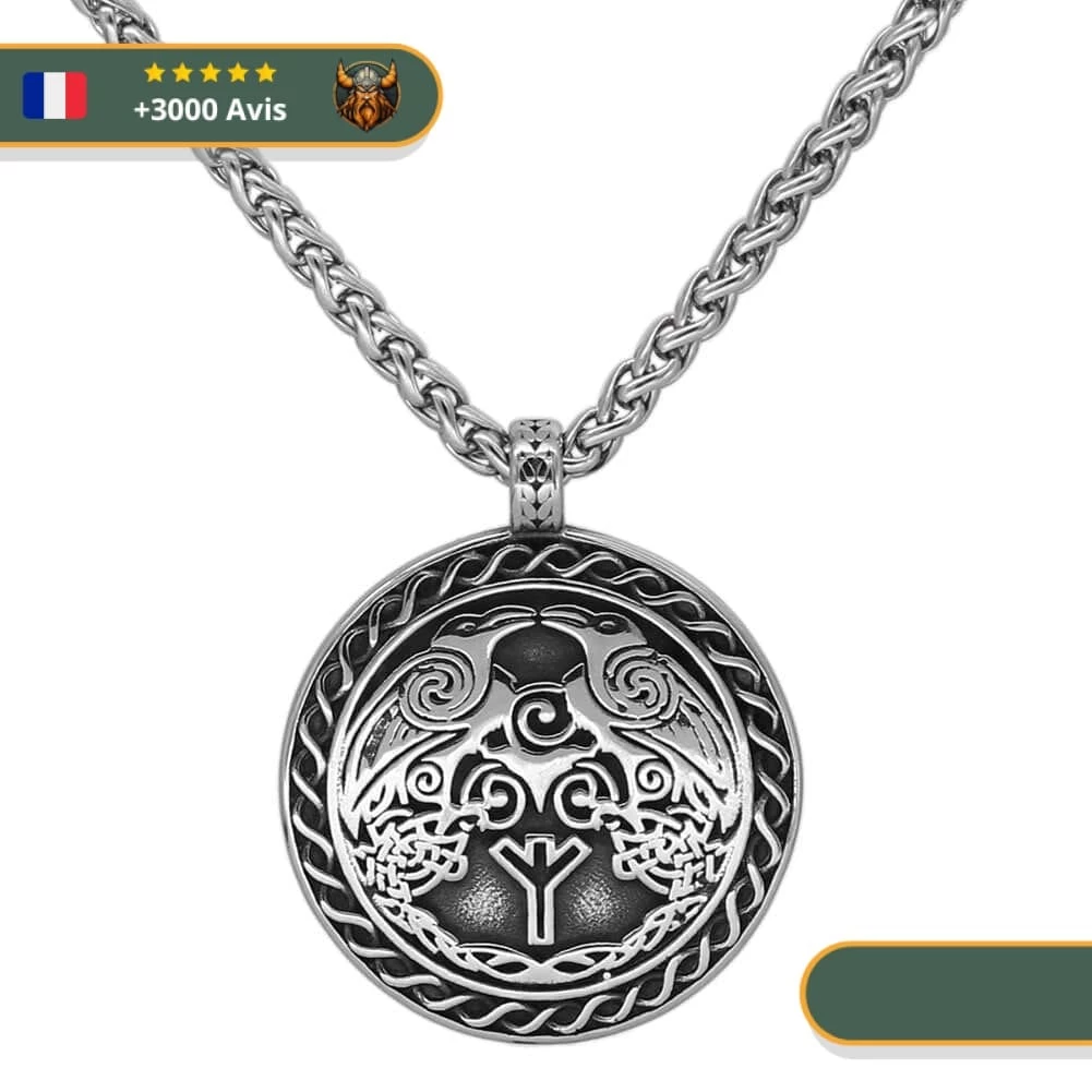 Montrez votre force et votre autorité en arborant ce magnifique collier Viking. Son pendentif est orné des incroyables corbeaux d’Odin, Hugin et Munin, les accompagnateurs du plus puissant des dieux nordiques. Faite en acier inoxydable, cette pièce unique et exclusive n’est pas vendue en magasin.