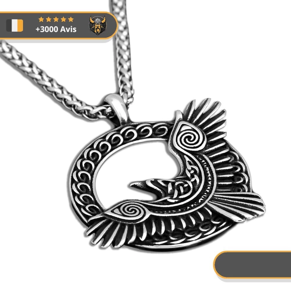 Notre pendentif spécial représente Hugin, le corbeau mythologique du dieu Odin. Pendant la journée, Hugin voyage autour du monde et rapporte ce qu’il a vu à Odin une fois la nuit tombée.