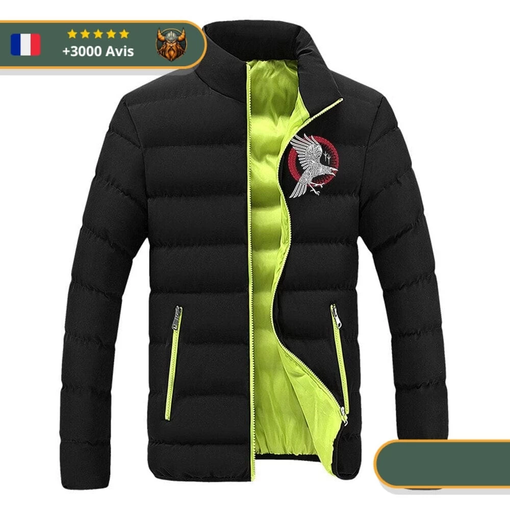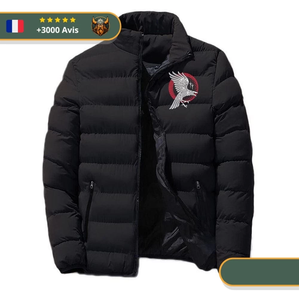 Restez au chaud tout en style grâce à notre magnifique doudoune viking. Son torse est orné par le célèbre corbeau Hugin et dans le dos vous verrez un imprimé représentant le symbole Valknut.