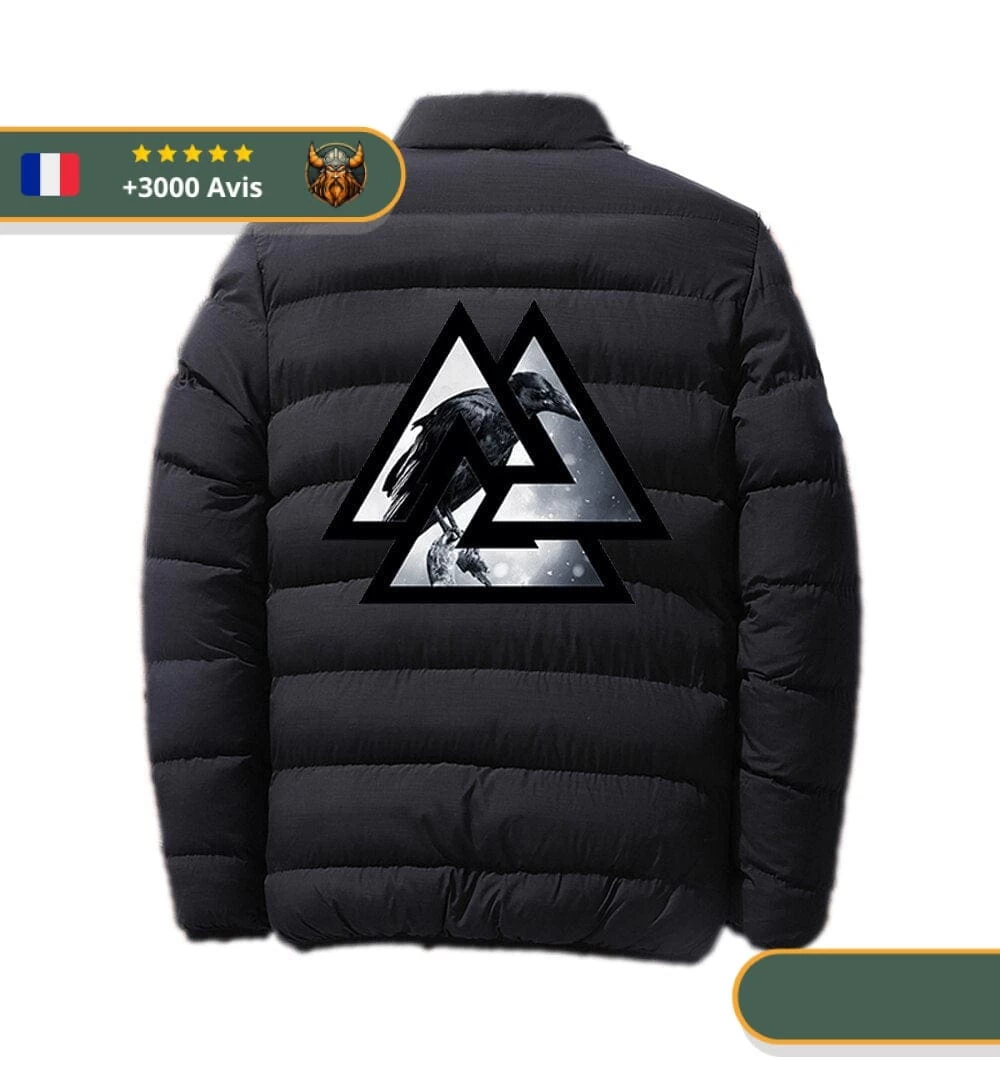 Restaurez votre élégance en optant pour notre sublime doudoune viking. Son torse est orné du fameux corbeau Hugin, et sur le côté, vous découvrirez un imprimé représentant le Valknut.