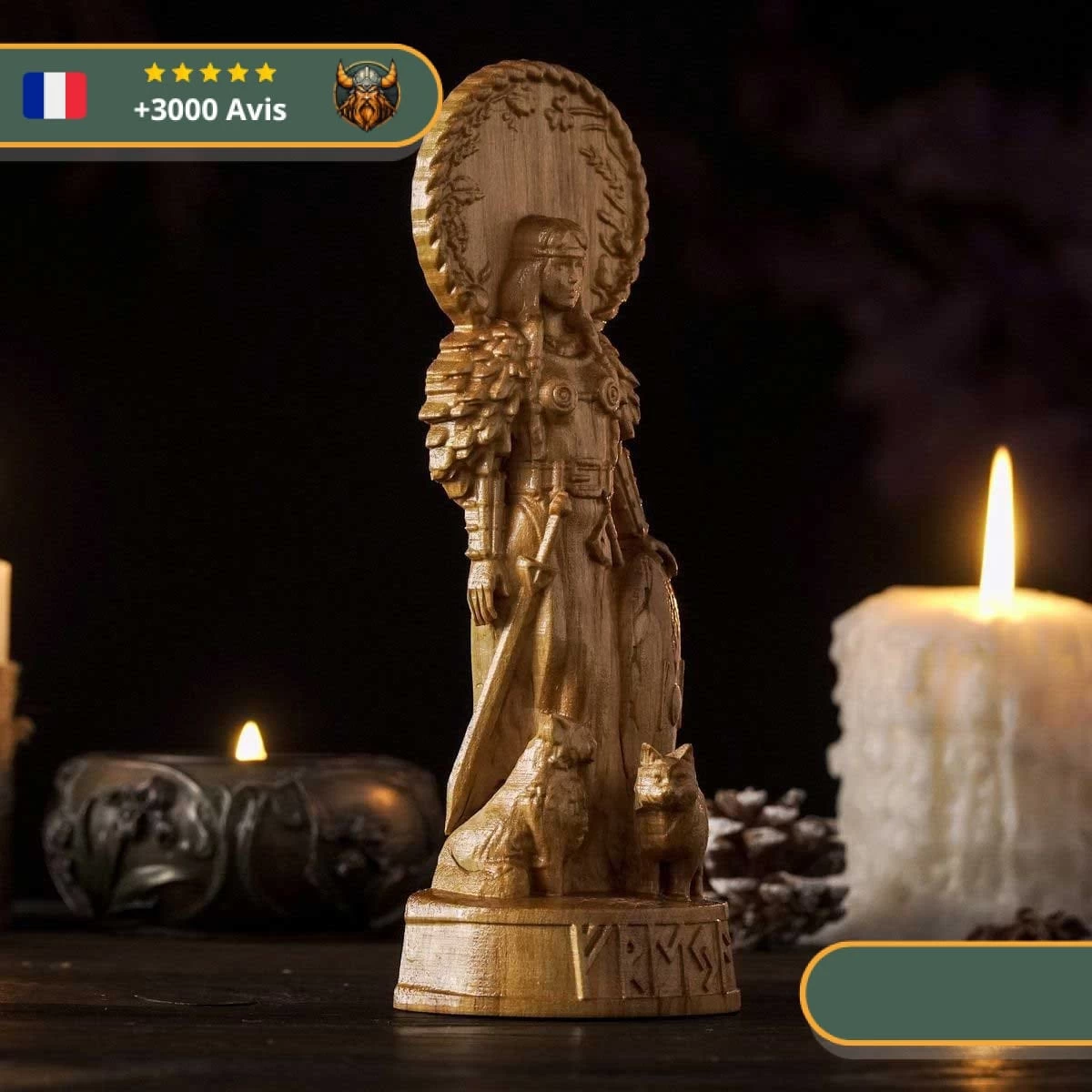 Vénérée par les vikings pour ses étonnants pouvoirs, Freyja est souvent représentée avec ses deux chats tirant son char magique. Elle est aussi connue sous le nom de « Vanadis ». Pour rendre votre autel aux dieux nordiques plus beau, nous vous proposons cette magnifique statue en bois verni.