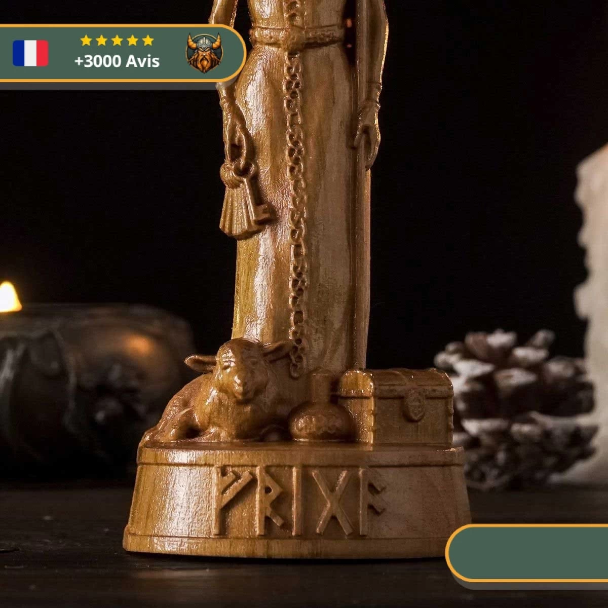 Dans la mythologie nordique, Frigg joue un rôle important. Elle est à la fois l’épouse du dieu Odin, mais aussi déesse de l’amour, du mariage et de la maternité. Cette déesse a le pouvoir de déterminer le destin des humains et l’avenir du monde. Elle est traditionnellement représentée avec sa lance et ses plumes d’oiseaux. Cette statue est un élément essentiel pour votre autel.