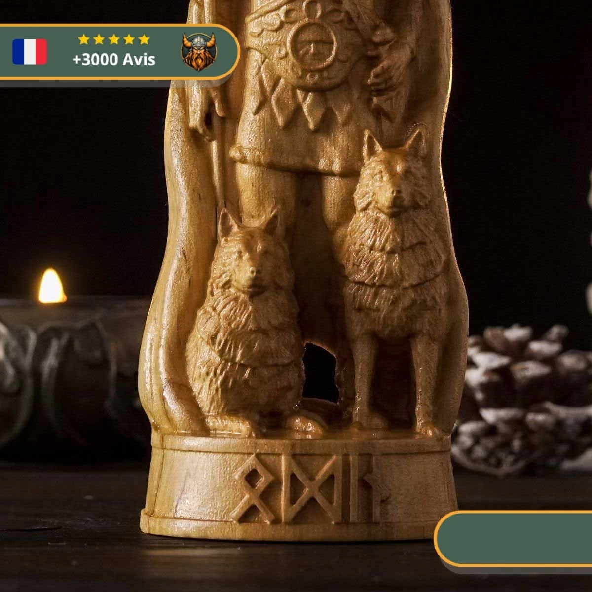 Wotan, plus connu sous le nom de Odin, est le dieu suprême de la mythologie nordique. Il réside à Asgard, dans son palais, et dirige le Valhalla. Il est toujours accompagné de ses deux loups, Geri et Freki. Sur ses épaules se trouvent ses corbeaux, Hugin et Munin, qui symbolisent la pensée et la mémoire. Ils sont les yeux d’Odin et lui apportent constamment des informations de ce qui se passe dans les neuf mondes de la mythologie nordique. Lors du Ragnarök, Odin, le dieu borgne, affrontera Fenrir, la plus grande catastrophe du monde nordique. Cette Statue sera parfaite pour votre autel.