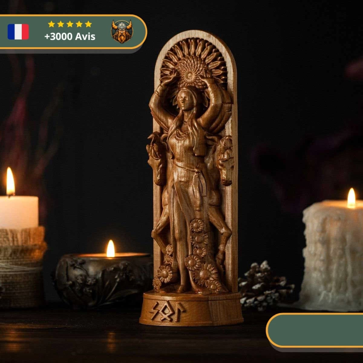 Dans la mythologie nordique, la déesse Sól représente la lumière et les bienfaits du soleil, leur donnant vie, fertilité et croissance. En compagnie de ses deux chevaux, elle illumine la terre et fuit devant le loup Sköll. Si ce dernier parvient à rattraper Sól, alors la fin des temps et le début du Ragnarök sont proches. La statuette en bois de cette déesse est parfaite pour apporter un rayon de lumière à votre autel.