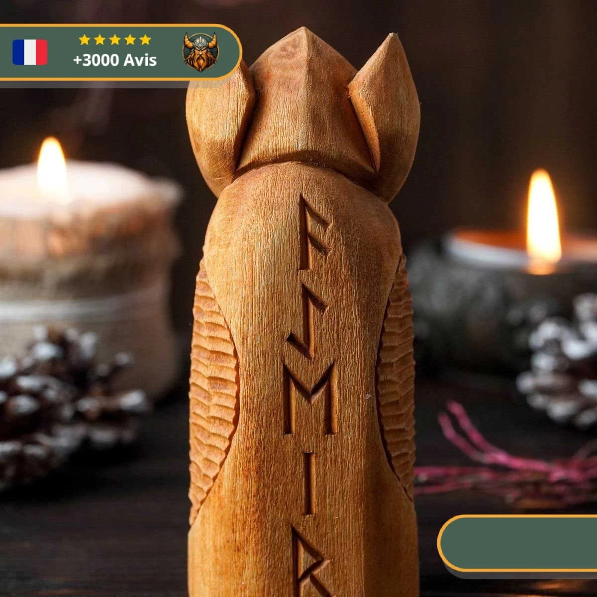 Gymir, de son autre nom, est un personnage mythologique scandinave. Il est l’ami des Ases et incarne l’océan et la mer. Son appellation signifie « Celui qui provient des eaux ». Aegir a neuf filles, qui sont des représentations des éléments de l’océan (les vagues, les flots, les mers déchaînées, etc.). Cette figurine en bois rend hommage aux mers qui ont soutenu nos ancêtres nordiques pendant des siècles.