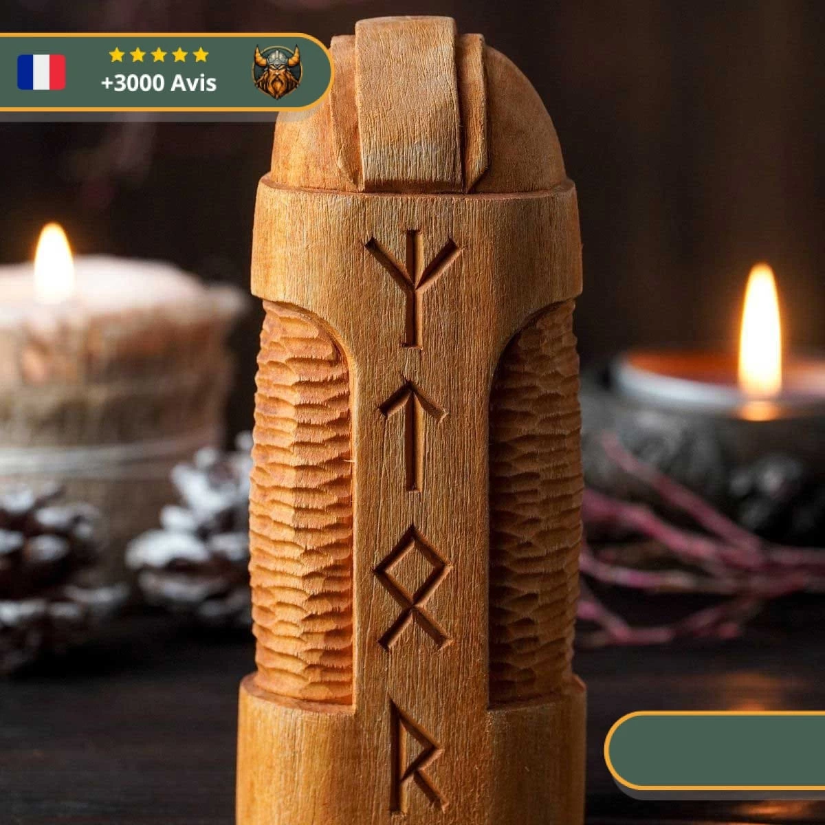 Thor est très célèbre pour être le dieu des énergies célestes. Il maîtrise la foudre et la tempête. Mais connaissez-vous son rôle dans le royaume de Midgard ? Thor est en effet le dieu gardien du monde des humains. Il est le plus fort de tous et possède des armes formidables. La plus connue étant son marteau Mjöllnir, visible sur cette statuette en bois. Choisissez cette statuette pour votre autel et obtenez la protection de Thor !