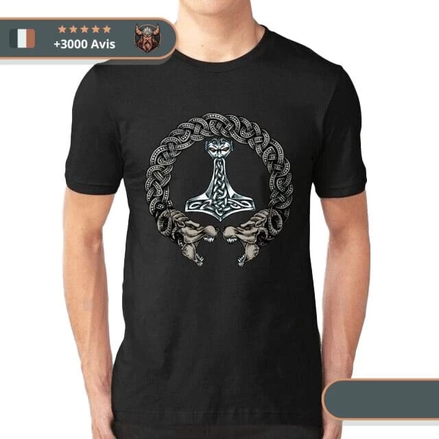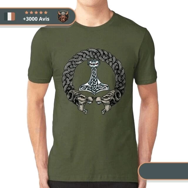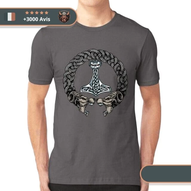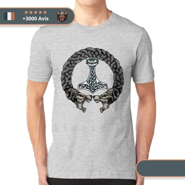 Ce T-shirt est une excellente union entre le clair et l’obscur, le bien et le mal. Il met en avant le Mjolnir entouré d’un bracelet dont les extrémités forment la tête du loup Fenrir.