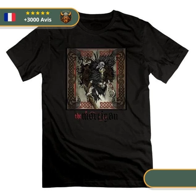 Ce t-shirt est orné de l’image de la Morrigan, surnommée « reine fantôme ». Elle apparaissait souvent sous la forme d’un corbeau noir, présageant un avenir sombre pour ceux qui l’avaient vue avant la bataille.