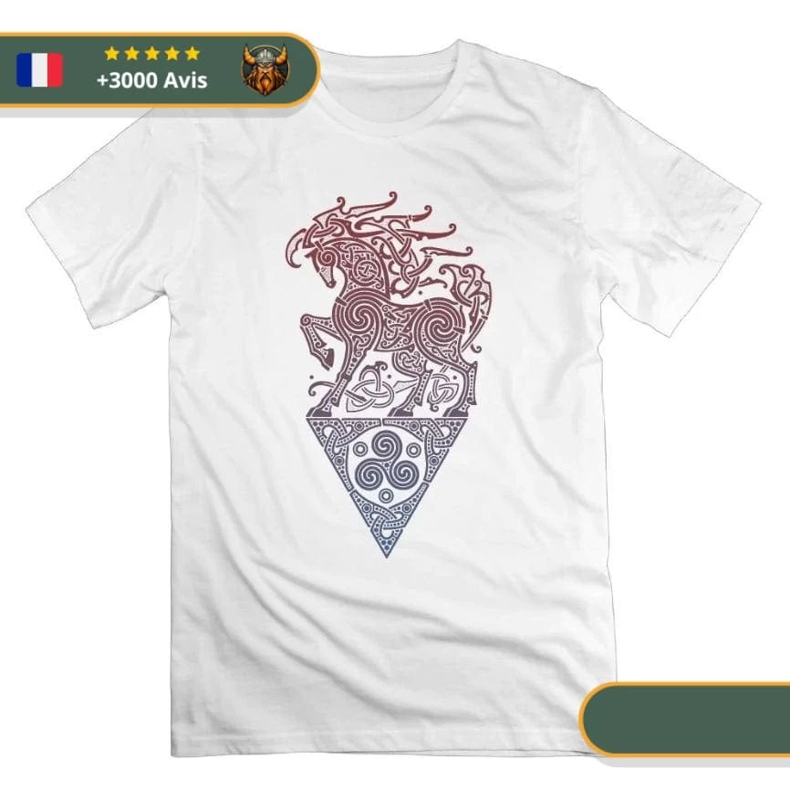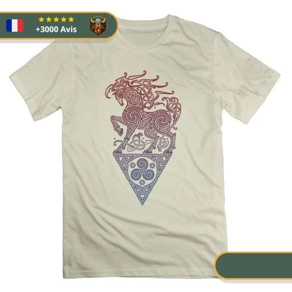 Ce t-shirt arbore Sleipnir, le cheval à huit pattes du dieu Odin. Il sert de monture à Odin lors de ses nombreux voyages à travers les Neuf Mondes.