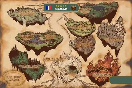 Les Neuf Mondes sont interconnectés par l’Arbre-Monde (ou Yggdrasil). Les Neuf Royaumes sont : Asgard (la demeure des Ases), Alvheim (le domaine des elfes), Vanaheim (la patrie des Vanirs), Svartalvheim (la terre des nains et des elfes noirs), Midgard (le monde des humains), Muspelheim (le pays du feu), Nivlheim (l’univers de la brume et de la glace), Jotunheim (le pays des géants) et enfin Helheim (le territoire de la mort.