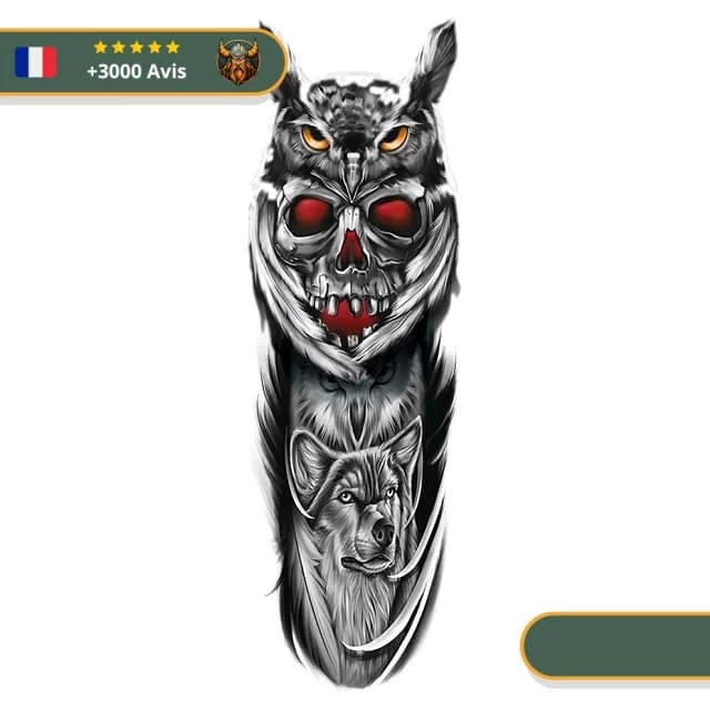 Montre que ta force vient des instincts de la faune nordique en portant ce tatouage temporaire représentant un hibou, un crâne et des loups scandinaves.