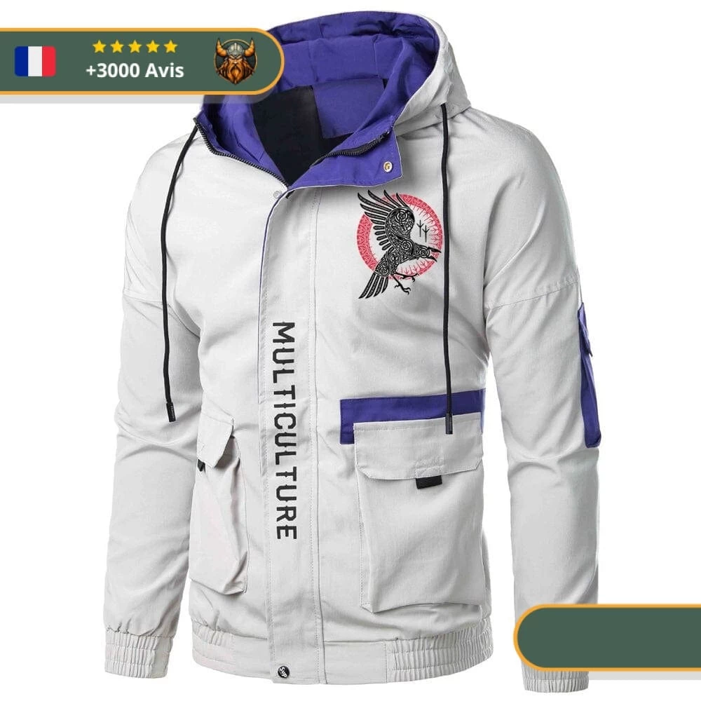 Affrontez le froid glacial avec notre veste viking sublime ! Notre veste chaude et douillette arbore un imprimé sur le torse représentant le corbeau Hugin.